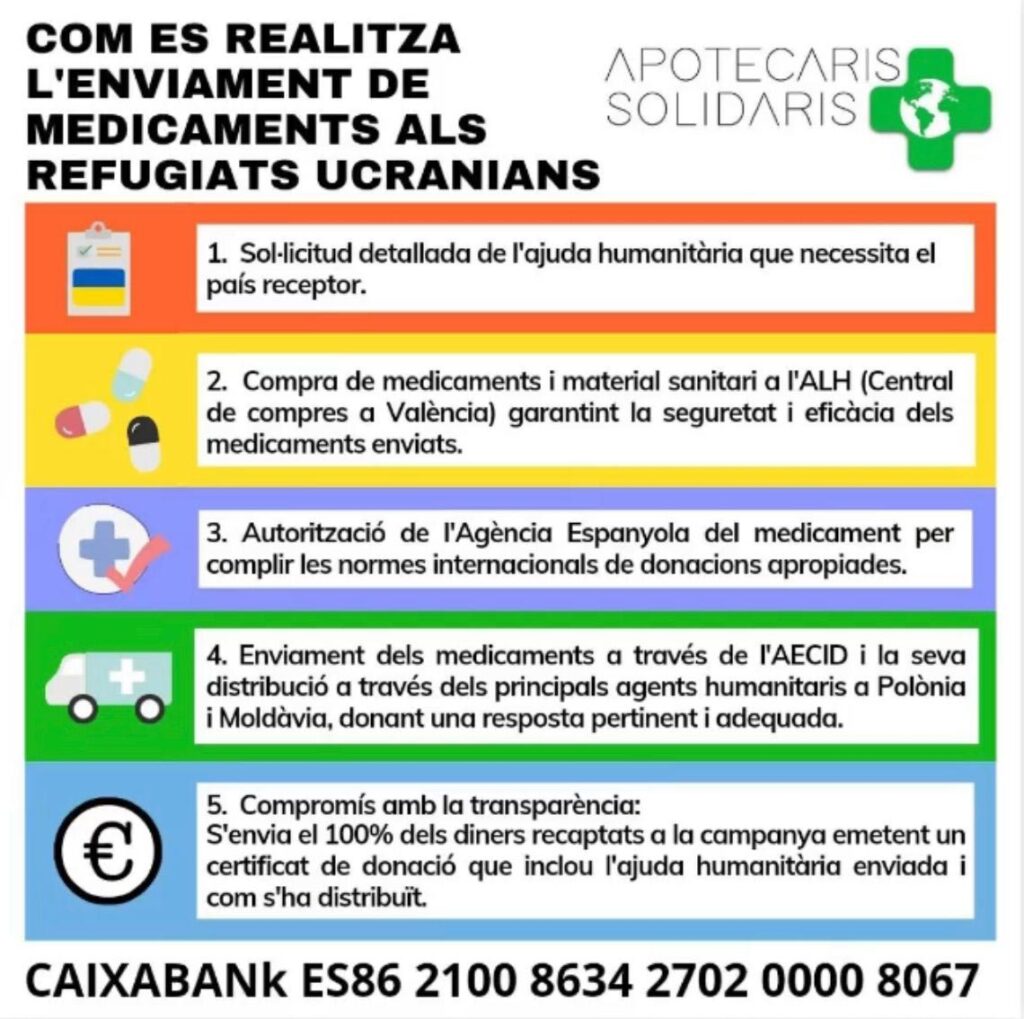 D’acord amb les recomanacions de l’OMS i a la legislació vigent, els medicaments donats han de tenir les mateixes garanties de qualitat, seguretat i eficàcia que aquells comercialitzats al nostre país. No hem d’enviar el que volem, sinó el que es necessita. En situacions d’emergència, com la present guerra a Ucraïna, es genera una resposta solidària per part de la ciutadania que cal saber canalitzar de la forma adequada per a una eficient i correcta gestió dels recursos.