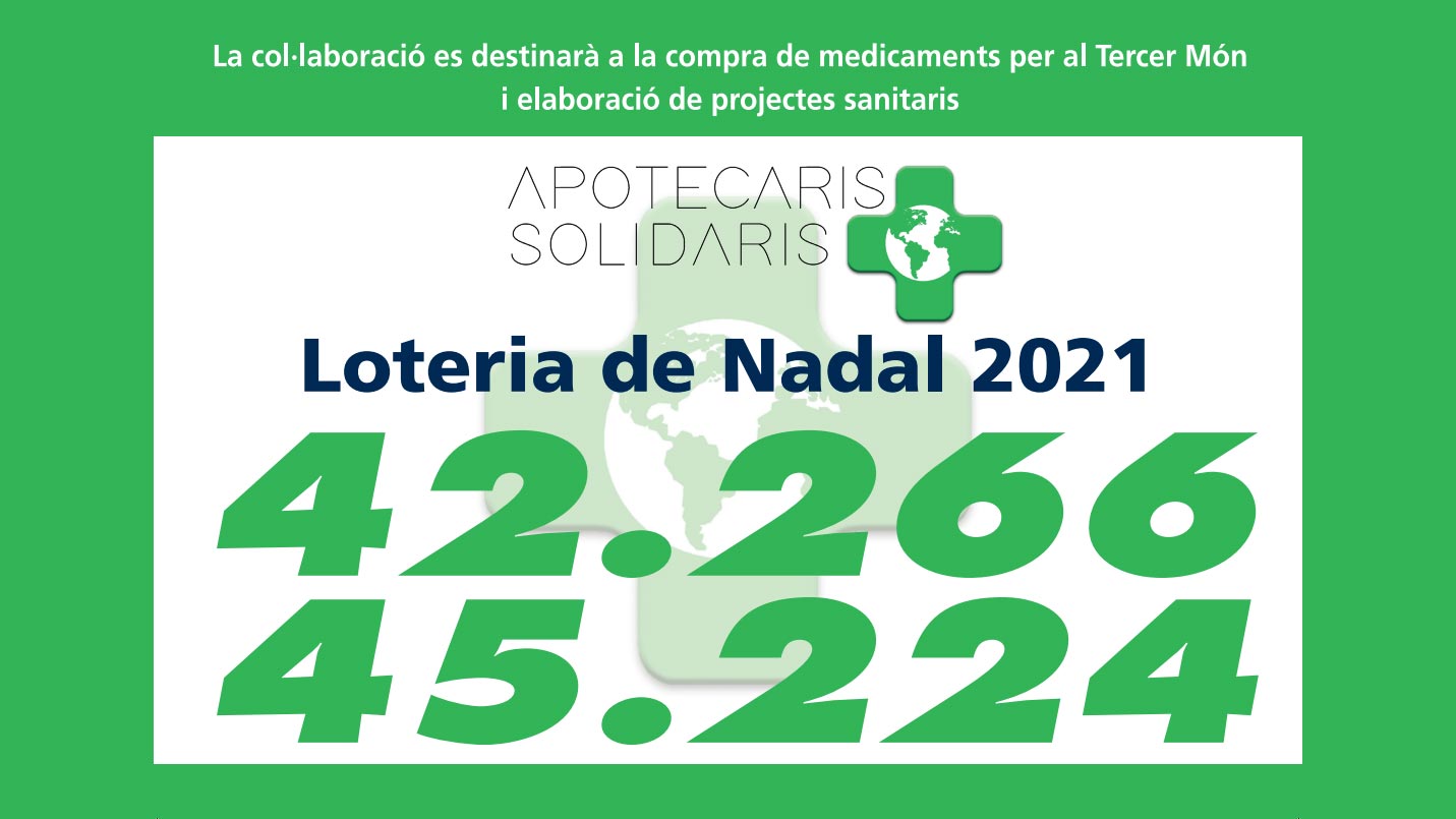 Com cada any, Apotecaris Solidaris torna participar en el Sorteig Extraordinari de Nadal del 22 de desembre de 2021, cosa que participa a tots els farmacèutics i ho posa a la venda en forma de paperetes de loteria. Apotecaris Solidaris vendrà talonaris amb dos números 42.266 i 45.224.