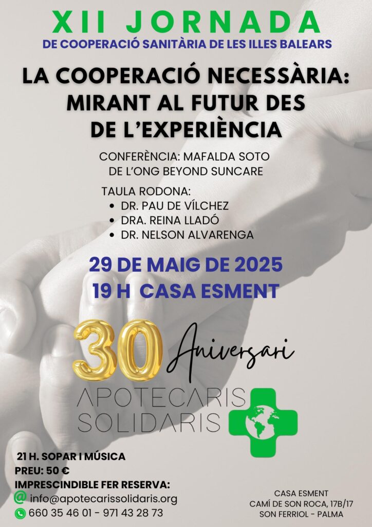Apotecaris Solidaris es complau a anunciar la celebració de la XII Jornada de Cooperació, titulada «La cooperació necessària: mirant al futur des de l’experiència», un esdeveniment clau en la seva agenda anual, que enguany coincideix amb el 30è aniversari de la fundació. Aquesta jornada es durà a terme el pròxim 29 de maig de 2025 a Casa Esment a les 19 hores, i reunirà professionals del sector farmacèutic, cooperants i representants d’entitats compromeses amb la salut global.